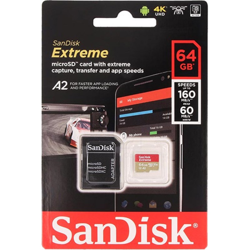 SanDisk Extreme microSDXC Class 10 UHS Class 3 V30 A2 64Gb - высокопроизводительная карта памяти, которая идеально подходит для использования в экшн-камерах, дронах и премиальных видеорегистраторах. Карта памяти SanDisk Extreme® microSD™ UHS-I со скоростью чтения и записи до 160 МБ/с и 60 МБ/с соответственно обеспечивает именно ту скорость записи и воспроизведения, которая нужна, чтобы снимать самые захватывающие приключения в мельчайших подробностях с разрешением 4K UHD и Full HD.